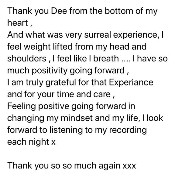 Using these cutting edge techniques Dee’s personalised Hypnotherapy programmes not only relieve the symptoms of anxiety, stress and more, but also eliminates the underlying triggers and root causes so you can enjoy long term health and happiness.