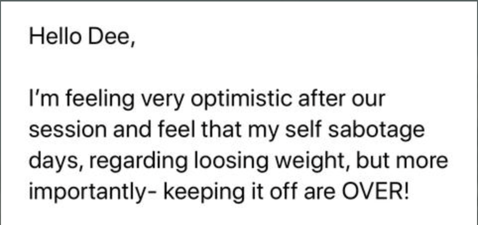 Dee’s gentle and caring nature, extensive knowledge, professional experience, and true commitment to the happiness and health of her clients has allowed her to achieve an incredible 98%* success rate when treating client anxiety, panic attacks and stress.